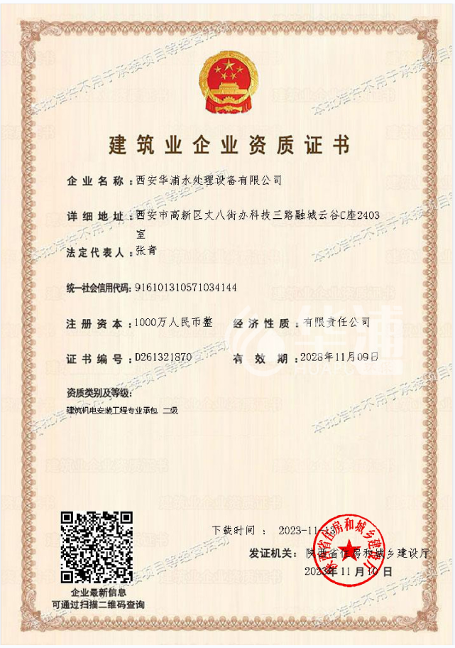 近日,西安華浦環(huán)保水處理設(shè)備有限公司建筑機(jī)電安裝工程資質(zhì)升為二級。此次資質(zhì)等級的提升,使我司資質(zhì)等級和專業(yè)水平又上了一個新臺階,進(jìn)一步增強(qiáng)了公司的市場競爭能力,為公司做大做強(qiáng)打下了堅(jiān)實(shí)的基礎(chǔ)。